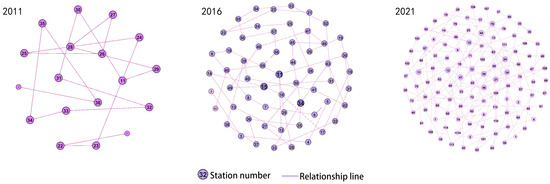 The sites were numbered, and the adjacency matrixes were built based on whether the sites were directly connected. This study simplified the metro stations and routes as Space-L networks from 2011 to 2021 and took topology networks as plotted in Figure 6 as the example in three time slices of 2011, 2016, and 2021. Consequently, the complex network characteristics of the Xi’an metro were depicted using the parameters of degree, betweenness, and closeness using Matlab R2021b software.