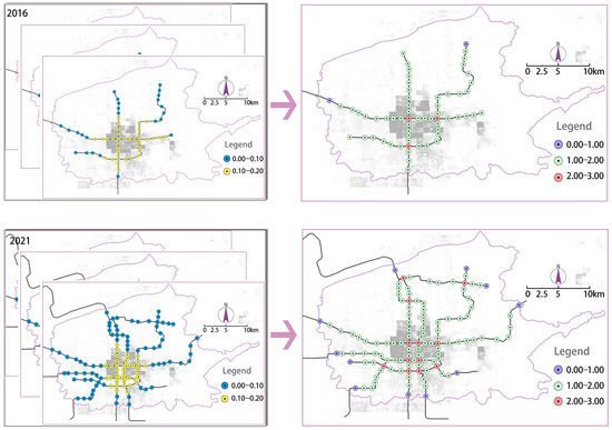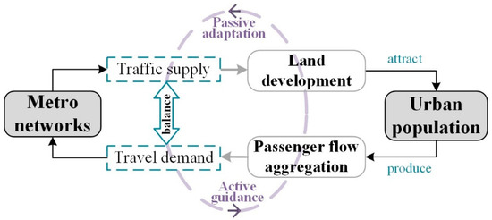 On the other hand, urban population, as a typical element of spatial structure, its development scale, zoning layout, and density produces the passenger flow aggregation, which determines travel demand [19]. The matching relationship between metro networks and urban population impacts the metro networks’ utilization efficiency. At the same time, the bidirectional mechanism mentioned above always runs through the whole urban development process. As plotted in Figure 14, in the early stage of metro development, the urban population is the root cause of traffic demand, and the metro skeleton needs to adapt to travel demand, showing the characteristics of “passive adaptation” [7]. Afterward, the metro networks offer the “active guidance” mode, which can lead the population to spread to the outlying areas.