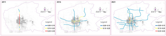 This study interrupted and separated metro routes according to the location of station distribution, described the status of link elements using betweenness in complex topological networks, and performed spatial visualization analysis. The evolutionary characteristics of the betweenness value of links from 2011 to 2021 are shown in Figure 9. The larger the value, the higher the position of the corresponding link in the networks. The betweenness index of metro links had a decreasing circular distribution from the center to the periphery, with values ranging from 0 to 0.3, with an apparent spatial spillover effect.
