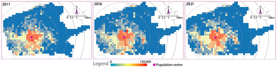 From 2011 to 2021, the coordinates of the population center were (108.950, 34.265), (108.955, 34.265), and (108.952, 34.264). Since the spatial distance between the metro middle and the population gravity center was low, the fitness values were 0.937, 0.914, and 0.927 (Table 5), with a high matching level. In the early stages, metro planning was highly catered to the population distribution, and the fitness value was at its highest level in 2011. With the increase in new routes, the metro middle deviated from the population gravity center, which signals a shift in the interaction of the metro networks’ influence on the population.