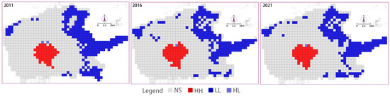 The spatially dependent features of metro links were further explored using the ArcGIS 10.2 tool. The global Moran’s I value reduced from 0.782 in 2011 to 0.510 in 2021. The p-scores were less than 0.01, and the z-scores were more than 2. The high-confidence results indicate a significant spatial autocorrelation of metro routes with a spatial spillover effect. In the process of metro construction, the Moran index of metro routes shows a spiral rather than a straight-line decline (Table 2); this may be because the spatial dependence of metro routes was characterized by agglomeration–homogenization–agglomeration with the opening of new routes. Ultimately, the general trend was gradually weaker, possibly due to the metro element’s homogenization distribution with the topology network densification [50].