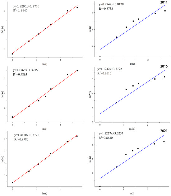 where S1 is the constant coefficient, and linear regression results in DS, that is, the urban population pattern radius dimension. The following equation produces the fractal dimension identity value: