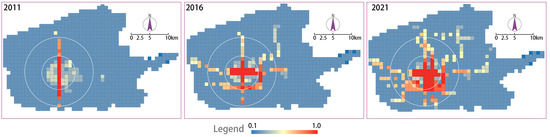 The comprehensive coordination index assessed the relationship between metro networks and urban population matching from a global perspective, and it may blur the spatial heterogeneity of the coordination relationship. As presented in Figure 13, the coupling coherence degree attached to grid cells can supplement the gap through Equations (17)–(19). According to existing studies [32], three ranks of matching relationships were classified according to the D value: D ≤ 0.25 is a low-level mismatch; 0.25 < D ≤ 0.5 is a medium-level fit; and 0.5 < D is high-level overdevelopment. From 2011 to 2021, the matching value at most spatial units improved from low-level mismatch (D ≤ 0.25) to medium-level fit (0.25 < D ≤ 0.5), and there was apparent spatial heterogeneity (Figure 13). Among them, the proportion of spatial units with a low-level mismatch decreased from 95.66% to 82.85%. Correspondingly, the proportions of spatial units with high-level overdevelopment (0.5 < D) were 3.11%, 8.19%, and 13.05% from 2011 to 2021, respectively. Overall, the spatial units that improved from a low to medium level were mainly clustered in the areas along the metro routes. The opening of stations and routes could boost the accessibility of the areas around the metro networks, which could meet the daily travel demands of residents. It is worth noting that the spatial units with a high-level matching (0.5 < D) between population distribution and the metro networks have always been mainly concentrated in the core circle of 0–10 km, where there were more hub metro stations, which significantly improves the efficiency of the metro supply to meet the demand of high-density population traveling.