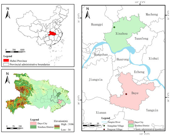Situated in the central region of the Yangtze River, Hubei Province spans 185,900 square kilometers and experiences a subtropical monsoon climate. Amidst the backdrop of Central China’s burgeoning strategy, the urbanization momentum of Hubei Province has surged over the past few years, and the coordinated development of the Wuhan Metropolitan Area has especially yielded remarkable outcomes. The two pilot areas selected for this research, Xinzhou District and Daye City, are in the close circle of the metropolitan area (Figure 2). Xinzhou District, located in the northeast of Wuhan and on the north bank of the Yangtze River, spans 1463.43 square kilometers. According to Hubei Provincial Statistical Yearbook, it owns 12 administrative streets, 1 town, 1 economic development zone, and 1 scenic area, with a population of about 929 thousand. Xinzhou District is one of the vital agricultural bases in Wuhan and serves as a significant industrial area within the region. Daye City lies in the northwest of Huangshi City, and on the south of the Yangtze River. The county-level city governs 5 administrative streets, 11 towns, and 2 administrative areas, with a population of about 999 thousand people. It has been identified as the first batch of the national resource-exhausted city transformation pilot, the third batch of the national comprehensive pilot for new urbanization, and the pilot city for the new round of national rural housing system reform. Both Xinzhou and Daye were designated as pilot areas for the “three rights separation” reform of RHs in August 2018. Since Xinzhou District and Daye City explored voluntarily compensated withdrawal from homesteads, a series of regulations and policies have been formulated regarding rural homestead planning and layout, land area standards, village appearance, cultural inheritance, environmental protection, qualification verification, and transfer of RHs, thus forming a unique mode for WRH with a series of accomplishments being achieved. These experiences have certain reference value for Hubei Province and even the whole country.