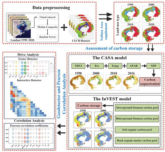 Therefore, this study selected Landsat image data from 1990, 2000, 2010, and 2020, extracted land use data using a random forests algorithm, and utilized the InVEST and CASA models to evaluate the spatiotemporal patterns of carbon storage in the Jiaozhou Bay coastal zone. GeoDetector was employed to identify the driving factors, and Pearson correlation analysis was conducted to analyze the relationships between different factors affecting carbon storage. The goal of this study is to provide decision support for the protection and land use adjustment strategies of the Jiaozhou Bay coastal zone, as well as for the sustainable management of the coastal zone. Figure 1 shows the overall research process of this study.