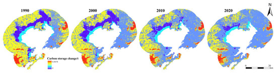 In terms of spatial changes, the carbon storage in the coastal zone of Jiaozhou Bay exhibits significant spatial heterogeneity. The area along the bay is dominated by artificial land surfaces, heavily influenced by human activities. As a result, the carbon storage in this area remains low, classifying it as a low-carbon zone. From 1990 to 2020, the low-carbon zone expanded annually, spreading from the coastal area, gradually fragmenting and eroding the integrity of the high-carbon zones. This expansion caused a significant reduction in high-carbon zones, which retreated inland and became increasingly fragmented (Figure 4). Specifically, the high-carbon zones were distributed in patches and bands in the eastern and southwestern parts of the study area, located at relatively high elevations, mostly mountainous regions, with lush and diverse vegetation providing a rich source of soil organic carbon. The highest carbon density in these areas could reach 116.62 . In contrast, the low-carbon areas were mainly distributed along the coast of Jiaozhou Bay, comprising built-up areas and aquaculture ponds, with the lowest carbon storage values at only 12.49 . From the perspective of spatial pattern changes, the period from 1990 to 2000 saw significant shifts, primarily with medium–high-carbon areas transitioning to low-carbon areas in the eastern part of the study region, and the gradual loss of dominance of medium-carbon areas. From 2000 to 2010, the spatial pattern became further fragmented, with low-carbon areas surpassing medium-carbon areas for the first time and becoming the dominant type. Between 2010 and 2020, the spatial pattern stabilized, the rate of change slowed, and the ecological environment gradually stabilized. Overall, the carbon storage in the coastal zone of Jiaozhou Bay shows clear spatial differentiation characteristics. High-carbon areas are gradually decreasing and retreating inland, while low-carbon areas are expanding, fragmenting, and eroding the integrity of high-carbon areas, leading to their fragmentation. This trend reflects the dynamic and complex nature of the spatial distribution of carbon storage.