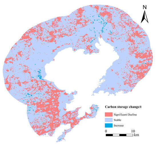 In terms of the trend of change, from 1990 to 2020, the carbon storage in the coastal zone of Jiaozhou Bay exhibited significant regional characteristics, characterized by large-scale aggregation and sporadic distribution. Among them, 74.13% of the areas had carbon storage that remained basically stable, 24.85% of the areas experienced significant decreases, and only 1.02% of the areas showed an increasing trend in carbon storage. The regions with significant decreases in carbon storage are widely distributed, mainly in noncoastal regions that have experienced dramatic urban expansion. In contrast, the areas with increasing carbon storage are smaller and scattered in the northern and western parts of the Jiaozhou Bay coastal zone. Carbon storage remains stable in most areas, especially in the coastal regions, which exhibit better integrity and stability. This suggests that in terms of the ecological environment, the coastal areas show strong stability (Figure 5).