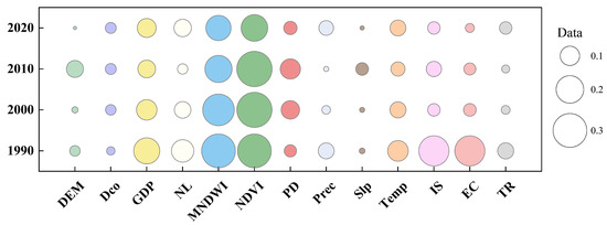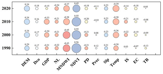 The interaction detector evaluates whether the interaction between two factors increases or decreases their explanatory power on the dependent variable [51]. By comparing the q-statistics of the factors detected individually and interactively, the assessment results can be categorized into five types. Table 4 presents the five categories of factor interactions [49].