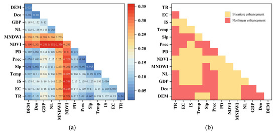 (a) Explanatory power of multifactor interaction detection (q); (b) type of interaction detection, where red indicates nonlinear enhancement and yellow represents bivariate enhancement.