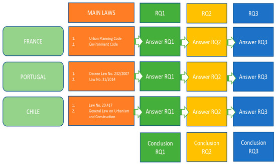 The methodology of this research is based on a comparative review of the regulations established in France, Portugal and Chile for the spatial planning instruments (SPIs) in use in each country, which are legally binding and at the local level. These criteria were selected to make appropriate comparisons between different countries but with similar plans (urban plans) and similar environmental management instruments (SEAs) at the same stage (follow-up).