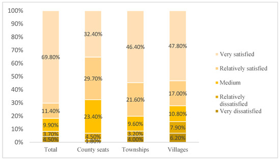The survey found that urban and rural residents were generally satisfied with their lives (Figure 3). The percentages of residents who were very satisfied and relatively satisfied were 69.8% and 11.4% respectively, totaling 81.2%, while the percentages of very dissatisfied and relatively dissatisfied totaled only 8.2%. In terms of community type, the satisfaction level of county seats residents is relatively low, with the total percentage of very satisfied and relatively satisfied at 74.7%, which is lower than that of townships (86.4%) and villages (82.8%).