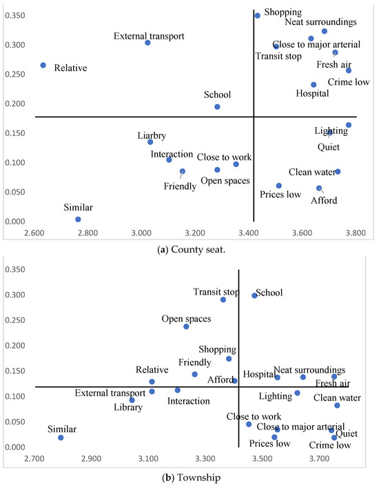 Based on the questionnaire data, the 21 neighborhood habitat characteristics were evaluated for importance and actual performance. As previously stated, the significance of this section is reflective of the respondents’ residential preferences and is explicitly important, as evidenced by the scores presented in Table 1. There are common preferences among residents of the three types of communities: county seat, township, and village; good community security, higher quality of water bodies, quiet environment, and fresh air are very important, while public buildings, external transportation, and the number of neighborhood interactions with relatives and friends are less important. Residents of the three types of communities also have differentiated preferences, for example, county seat residents consider street lighting and housing costs to be more important, while township and village residents value the proximity of their homes to major arterials. Additionally, village residents are very concerned about the availability of high quality elementary and secondary schools in their neighborhoods.