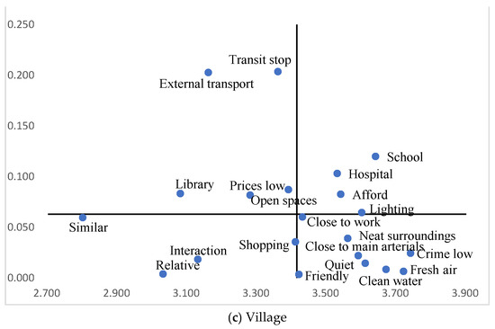 As previously stated, there are additional limitations to conducting an IPA analysis with only explicit importance and actual performance data. In this paper, we integrate the IPA with the Kano model to perform a three-factor analysis. Specifically, we employ both explicit and implicit importance for quadrant analysis. Explicit importance is derived from the questionnaire survey (Table 1), while implicit importance is calculated using the methodology of Yin et al. [20] and Chen et al. [37]. This involves a bivariate correlation analysis of explicit importance and life satisfaction, with the aim of obtaining the implicit importance of the habitat environment characteristics of the 21 communities (Table 3). The analysis revealed significant differences in the implicit importance attributed by residents of the three community types. For respondents in county seat communities, the most important environmental attributes were ease of access to shopping, a clean environment, proximity to major roadways, and ease of access to external transportation. In contrast, for respondents in township communities, the most important environmental attributes were the presence of high-quality primary and secondary schools, ease of access to public transportation, the presence of open spaces such as parks, and ease of access to shopping. For respondents in the village community, the most important environmental attributes were easy access to bus stops, external transportation, high-quality primary and secondary schools in the vicinity, and proximity to hospitals and clinics. Among the environmental attributes with low implicit importance, county seat respondents did not consider price level, housing cost, and similarity of economic level with the surrounding residents to be of significant importance. In contrast, township respondents considered economic similarity, community policing, and price level to be of low importance, while village respondents did not consider friendly residents, the presence of numerous family and friends in the surrounding area, and fresh air to be of importance.