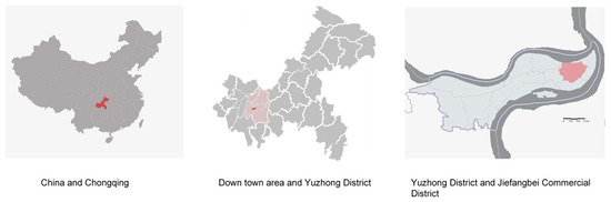 Jiefangbei Business District is located in the historical city center of Chongqing. Figure 2, “Jiefangbei” translates to “the People’s Liberation Monument” in Chinese and represents the oldest high-density commercial core area in Chongqing. A century ago, the Jiefangbei area was known as “Dashizi”, a traditional street lined with Bayu folk houses. Over nearly a hundred years of development, the Jiefangbei area has witnessed significant historical milestones, including the opening of the ports of Chongqing in the late Qing dynasty, modernization during the early Republic of China, the War of Resistance against Japanese aggression, the War of Liberation, the founding of New China, the reform and opening-up period, and the establishment of Chongqing as a directly administered municipality. These stages have left a rich historical and cultural heritage [31].