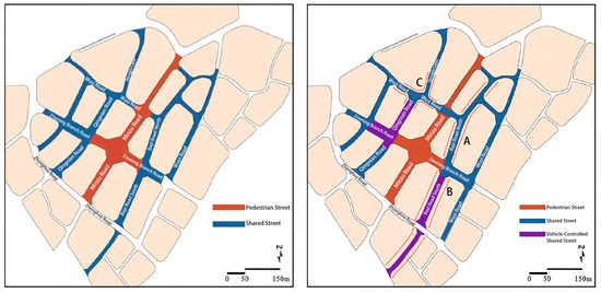 Shared street in Jiefangbei Business Street: Before 2022 (Left) and present (Right); A: Northern Section of Bayi Road; B: Southern Section of Bayi Road; C: the intersection of Wusi Road and Jiangjiaxiang. Source: Authors adapted from Zhang and Yao (2022) [19].