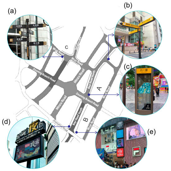 Different Signs in Shared Streets of Jiefangbei District: (a) a type of directional sign; (b) another type of directional sign; (c) a typical informational sign; (d) specially designed night-market signs; (e) vertical advertising sign. Source: Figure was made, and photographs were taken by the authors.