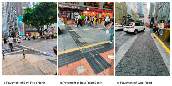 In terms of place symbols, a total of 23 photos were collected. After processing 10 photos with repeated content or overlapping elements of concern, 13 photos were retained. These included one photo of a lamp, six photos of pavement, three photos of vehicle-blocking devices, and three photos of flower beds and pots. The following conclusions can be drawn from the analysis: In pavement design, the north section of Bayi Road, Wusi Road, and Jiangjia Lane divide the space for people and vehicles through differences in material, color, and texture of the ground pavement, or by utilizing median strips and gutters, as shown in Figure 5a,c. The southern section of Bayi Road is divided by strong color contrast and yellow lines, as illustrated in Figure 5b. According to the evaluation criteria of the UK Department for Transport (2010) [9], the southern section of Bayi Road has a high degree of sharing, but to ensure pedestrian safety, the entry of motor vehicles is restricted.