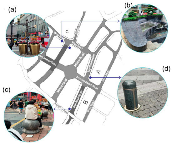 Street Furniture of Selected Shared Street Case: (a) a metal flower bowl and a typical street light beside it; (b) fixed flower beds with complex functions; (c) blocking stones were used as seats; (d) blocking columns. Source: Figure was made, and photographs were taken by the authors.