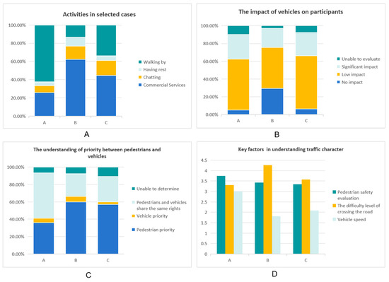Social-function and Traffic-function Analysis for Selected Cases: (A) the percentage of activities; (B) the impact of vehicles on participants; (C) street users’ understanding of priority; (D) key factors in understanding traffic character. Source: Authors.