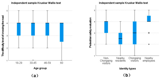To explore the performance of streets with different levels of sharing in terms of safety and effectiveness, this study examined the relationship between pedestrians’ perception of the right of way and the safety and effectiveness of shared streets. The Kruskal–Wallis test found no significant correlation between the perceived right of way and respondents’ perceived safety and road crossing difficulty (p-values were all greater than 0.05). This indicates that in the Jiefangbei Business District, pedestrians’ perception of their priority right of way does not determine psychological safety and has no direct relationship with the difficulty of crossing the road. Further analysis showed that the psychological safety of pedestrians was correlated with age (p = 0.037), particularly between ages 60+ and 18–29 (p = 0.009) and between ages 60+ and 30–45 (p = 0.011). Therefore, since a large proportion of the interview sample includes young people, the overall psychological security score of respondents may be higher due to the unbalanced age distribution of the sample. However, age had no significant effect on the ease of crossing the road (p = 0.074) (Figure 8a), as the low speed of vehicles in cases B and C and zebra crossing in case A minimized differences. The identity of participants was significantly correlated with the sense of security (p < 0.001), with nearby workers feeling the safest, followed by non-local tourists, local tourists, and nearby residents (Figure 8b). However, this difference was mainly caused by age, as 89.8% of non-local tourists were 18–45 years old, 70.8% of local tourists and 77.0% of nearby employees were 18–45 years old, and only 37.5% of nearby residents were 18–45 years old.