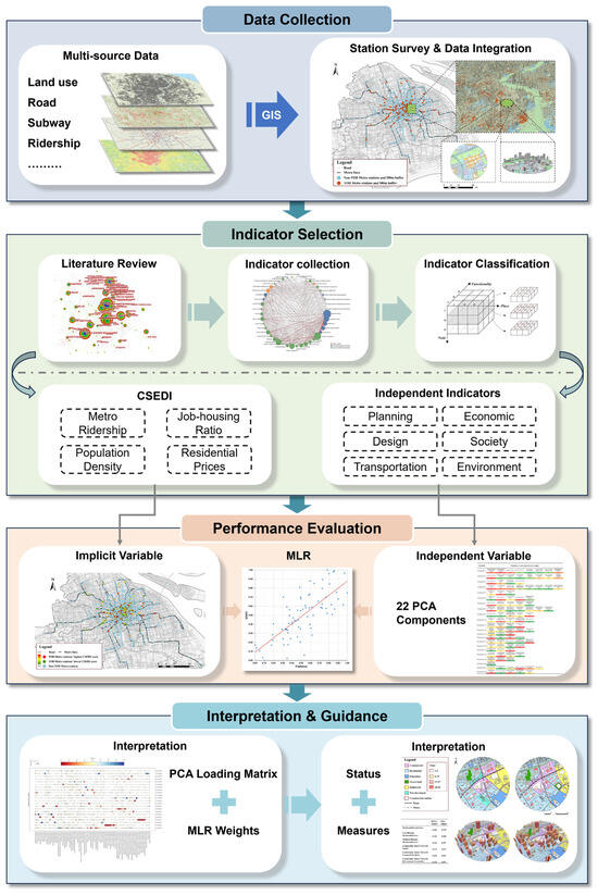 Our comprehensive literature review identified 71 independent variable indicators and 4 dependent variable indicators. We developed a method for calculating these using multi-source big data, leading to the creation of the Comprehensive Socio-Economic Development Index (CSEDI). Employing principal component analysis followed by regression analysis, we ascertained the relative significance of each indicator in evaluating TOD performance [43], effectively minimizing the biases and limitations inherent in single-indicator evaluations. Using Shanghai—one of China’s largest cities—as a case study, this research conducts an empirical evaluation of its rail transit stations. This examination aims to verify the performance and practicality of the proposed method. The anticipated outcomes are expected to furnish actionable insights for urban planners, enhance the progression of TOD-related theoretical frameworks, and exert a positive influence on practical applications within this field.