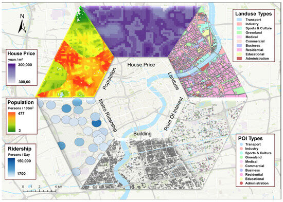 In the present study, a diverse array of data sources was employed to ensure a comprehensive analysis of the urban dynamics in Shanghai for the year 2021. OpenStreetMap, a collaborative platform akin to Wikipedia for maps, provided extensive street data, which are pivotal for delineating the urban infrastructure. Baidu Maps API supplemented this with detailed building outlines and additional street folds, offering precise geographic data tailored to Chinese locales. Gaode Maps API was instrumental in providing point of interest (POI) data, encapsulating essential amenities and facilities that highlight the functional aspects of the city. Population distribution was detailed using high-resolution raster data from Worldpop.org, which aids in understanding demographic dynamics; these are crucial for urban planning. Real estate transaction records from Lianjia.com were utilized to analyze the economic and residential trends within the city, reflecting the active real estate market in Shanghai. The Shanghai Metro supplied detailed subway layouts, which are essential for examining transit-oriented developments. Data on over 5000 car parks were obtained from the Shanghai Parking APP, developed by the Shanghai Municipal Government, providing insights into vehicle management and urban traffic flows. The EU–LUC–China dataset contributed land-use data, which are crucial for understanding land utilization patterns in urban planning. Finally, the Meituan APP provided data on commercial establishments and their classifications, offering a window into the commercial landscape of Shanghai. Each data source was carefully selected and integrated based on its relevance to urban roads and planning guidelines, ensuring a holistic view of the city’s urban framework.