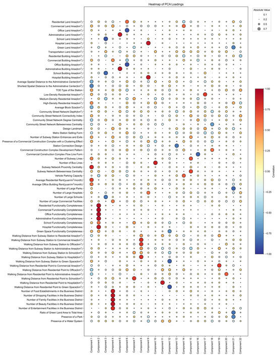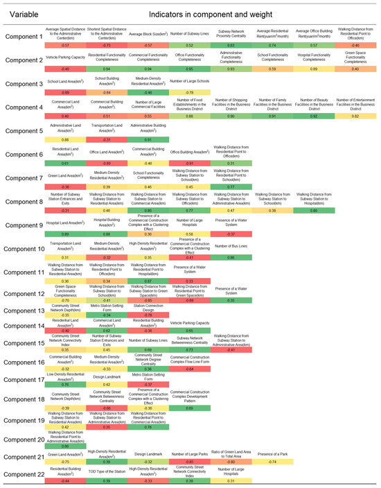 Among the key findings, several principal components stood out due to their distinct attributes and impacts: Principal Component 2 encapsulated all “functional integrity” indicators, which were assigned high positive weights, suggesting a strong association with comprehensive functionality within the station’s vicinity. Principal Component 3 comprised indicators related to the size of school facilities, with each receiving substantial negative weights, indicating a potential trade-off between school size and other community attributes. Principal Component 5 was heavily influenced by the area of administrative land and the floor space indicators, emphasizing the administrative capacity and physical infrastructure. Principal Component 8 attributed negative weights to the number of metro station entrances and exits along with positive weights to walking distances to various facilities. This suggests that higher values of this component correlate with higher costs to access services, denoting less convenience and greater travel distances within the station area. Principal Component 11 pertained to the cost implications of traveling from a metro station to residential areas and accessing health services, reflecting challenges associated with connectivity and accessibility. Principal Component 15 focused on transportation attributes, such as the number of buses and metros at the station, its strategic position in the network, and the station’s design centrality, which are crucial for efficient transit operations. Principal Component 18 centered on the design aspects of the TOD neighborhood, including road network design and the layout and configuration of commercial complexes, underscoring the importance of thoughtful urban design in enhancing TOD performance.