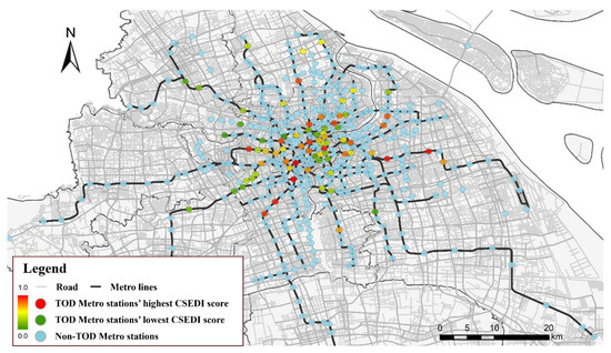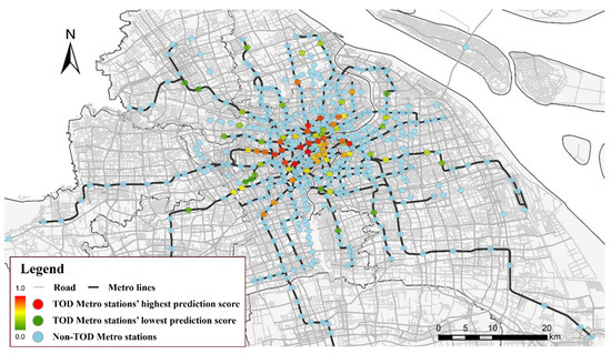 We identified a pattern of high-performing TOD locations near Rail Transit Line 1, where five out of the ten highest-ranked CSEDI and predicted sites are situated. These stations on Line 1 handle substantial daily passenger volumes, a testament to their early establishment and operational longevity. Over the past decade, as Shanghai has expanded, essential services such as educational facilities, healthcare centers, and commercial zones have developed around these high-traffic routes. The confluence of well-established infrastructure and high passenger volumes at these stations translates into high performance; these findings echo those in other existing studies [37,53].