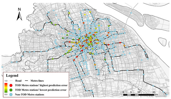 Figure 6, Figure 7 and Figure 8 each feature circles that represent a subway station and its 500 m buffer area. If a station is not a TOD site, it is colored blue. For TOD sites, a shift towards red indicates higher actual CSEDI values, higher predicted values, and larger prediction errors, respectively, in Figure 6, Figure 7 and Figure 8. Figure 6 and Figure 7 describe the spatial distribution of the CSEDI scores alongside the predictive scores for designated sites within Shanghai. The distribution in a spatial location shows a strong correlation between the model’s predictions and the actual scoring outcomes, particularly for sites that rank in the top 50% based on their scores. Notably, many of these high-scoring sites are characterized as significant transportation hubs, with a particular concentration around Lines 3 and 4, near the intersection with the outer elevated ring road.