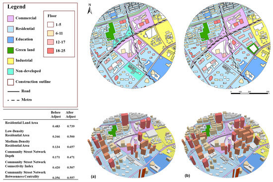 Utilizing the weights of each indicator within our predictive model, urban planners can effectively assess and adjust the planning schemes of TOD sites. For example, the Middle Longhua Road Station, initially scored at 0.389, ranked 35th among all of the stations evaluated. Located on the eastern side of Shanghai’s downtown and intersected by two subway lines, this station benefits from significant educational resources and certain locational advantages, as detailed in Figure 9. In Figure 9, panel (a) shows the two-dimensional plan and three-dimensional schematic of a site before redevelopment, and panel (b) displays the two-dimensional plan and three-dimensional schematic after redevelopment.