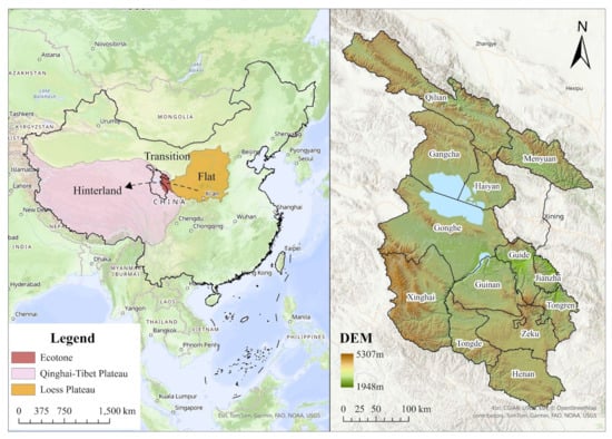 The Xining marginal area is located in Qinghai Province, including three administrative regions: Haibei Tibetan Autonomous Prefecture (Menyuan Hui Autonomous County, Qilian County, Haiyan County, and Gangcha County), Hainan Tibetan Autonomous Prefecture (Gonghe County, Tongde County, Guide County, Xinghai County, and Guinan County), and Huangnan Tibetan Autonomous Prefecture (Tongren City, Jianzha County, Zeku County, and Henan Mongol Autonomous County). Among them, Haiyan County, Gonghe County, and Tongren City are government-seated regions (Figure 1).