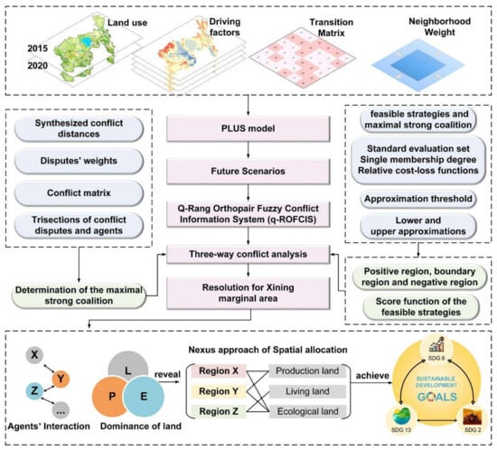 In this article, we emphasize nexus approaches [29] to understand the connections and synergies on spatial distribution optimization, and propose the concept of land use competitive advantages, i.e., the dominance of a region in developing a certain land use type. Correspondingly, we propose Pythagorean fuzzy conflict information (PFCI), a combination of the Pythagorean theorem and fuzzy theory, to calculate competitive advantages. As the mismatch between one-size-fits-all policies and complicated regional relationships violates the principle of nexus land use allocation, this article aims to address the above problem from the perspective of interactions between different land types and different regions, rather than considering them in isolation. Given the particularity of the Xining marginal area and sustainable development goals, we set up four scenarios, namely, natural development, urban development (SDG8, economic development), cultivated land conservation (SDG2, Zero Hunger), and ecological protection (SDG13, Climate action) to simulate the 2030 spatial pattern of PLE land in the Xining marginal area by the PLUS model. Then, we further propose the concept of land use competitive advantages and improve PFCI by introducing concepts such as the maximum doughty coalition, the trisections of four types of sets, and viable strategies. Based on this, we identify sets of advantageous land use types and regions. Ultimately, we put forward policy references to achieve nexus approaches to land use sustainable allocation based on regional endowments. In summary, our research aims to answer the following questions: