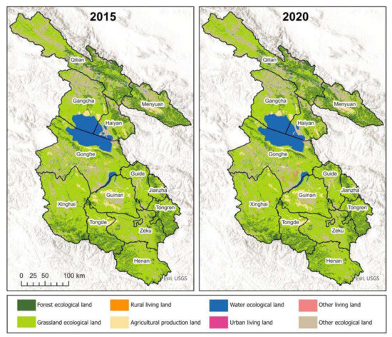 In 2015, the Xining marginal area had 3493.35 km2 of agricultural production land, 11,520.62 km2 of forest ecological land, 59,935.19 km2 of grassland ecological land, 6009.86 km2 of water ecological land, 34.22 km2 of urban living land, 128.65 km2 of rural living land, 27.68 km2 of other living land, and 14,950.42 km2 of other ecological land. In contrast, the Xining marginal area in 2020 had 3479.18 km2 (99.59% in 2015) of agricultural production land, 11,502.13 km2 (99.84% in 2015) of forest ecological land, 59,706.83 km2 (99.62% in 2015) of grassland ecological land, (103.14% in 2015) of water ecological land, 42.49 km2 (124.19% in 2015) of urban living land, 133.85 km2 (104.04% in 2015) of rural living land area, 180.51 km2 (652.17% in 2015) of other living land, and 14,856.35 km2 (99.37% in 2015) of other ecological land, as shown in Figure 3.