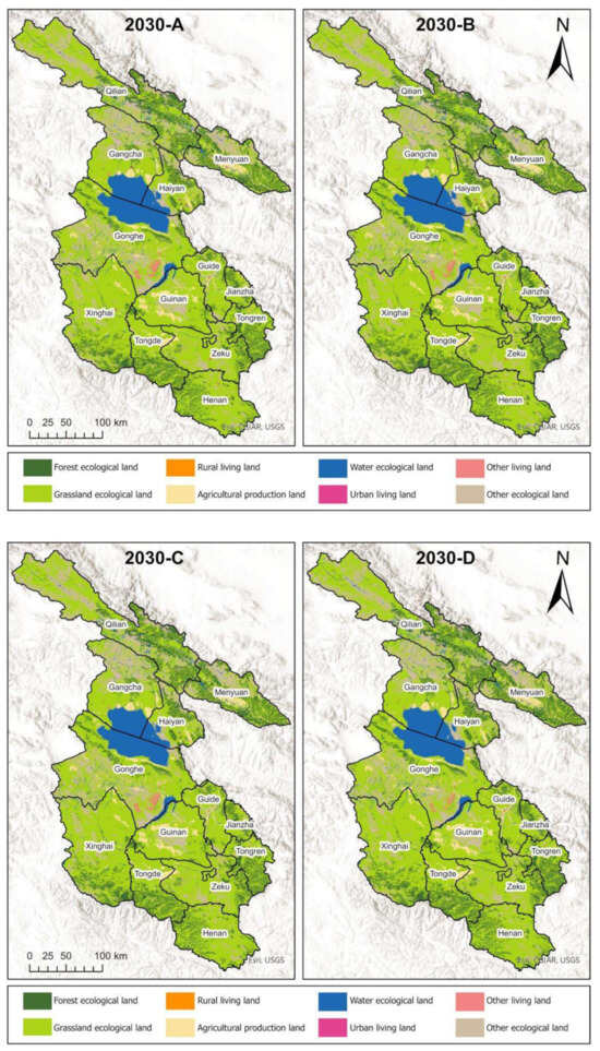 The urban development scenario (scenario B) suggests that the production land decreases, with the highest decrease in Henan County, while the living land will expand overall, with Gonghe County experiencing the fastest growth in the other living land. Regarding the ecological land, the grassland ecological land in Haiyan, Gonghe, and Guinan Counties will be significantly decreased, as will the other ecological land also reduce. The water ecological land changes little; Haiyan County and Gonghe County have increased, whereas the forest ecological land will increase in general. The widespread expansion of the living land demonstrates the prioritization of urban development, which to some extent occupies the grassland ecological land.