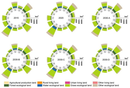 The Xining marginal area shows an evident core–edge pattern. We investigate the government seat as the core area (Haiyan County, Gonghe County, and Tongren City), and the remaining counties as external areas. The living land will increase overall, particularly the urban living land and other living land in the core areas, while the rural living land will see a similar growth rate. The agricultural production land will not grow significantly and may perhaps decrease in both the core and edge areas under scenario B. The grass ecological land and other ecological land may diminish more in the core areas under all the situations. Under scenarios A and C, the forest ecological land will decrease more in the core areas while under scenarios B and D, the core areas will witness more increase. The water ecological land will slightly increase in both the core and edge areas (Table 7).
