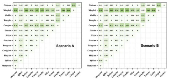 Xinghai County and Gonghe County are the primary sources of the grassland ecological land (b6) conflict, and they have the most influence in developing the grassland ecological land in all the scenarios. To be more specific, Xinghai County has a strong conflict relationship with Menyuan, Haiyan, Jianzha, Tongde, and Guide Counties, and Tongren City, but a weak conflict relationship with Gangcha, Zeku, Henan, and Guinan Counties. Gonghe County has weakdispute relationships with Menyuan, Haiyan, Jianzha, Tongde, and Guide Counties, and Tongren City (Figure 6). As a result, Xinghai and Gonghe Counties dominate in the development of the grassland ecological land.