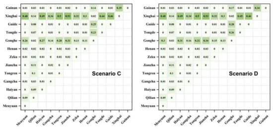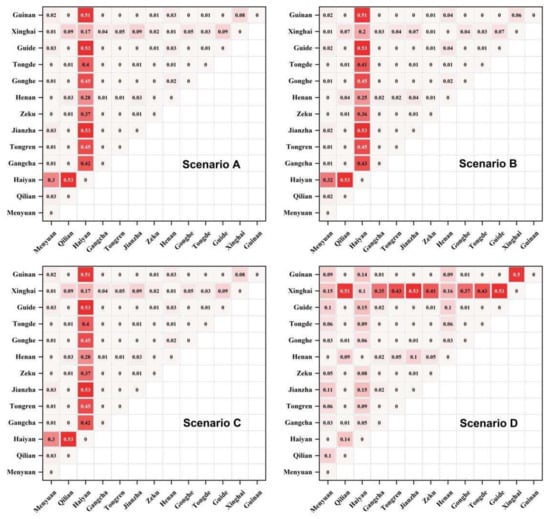 The urban living land (b3) may not have enough area to support the various forms of development, but as urbanization develops rapidly, its advantages will become more obvious. Additionally, it will become more crucial for regional development, appear to be a significant spatial conflict, and have a great deal of potential for economic development in the Xining marginal area. Haiyan County leads the development of the urban living land in the natural growth scenario (A), urban development scenario (B), and cultivated land conservation scenario (C), while Xinghai County dominates the development of the urban living land in the ecological protection scenario. Haiyan County has a significant conflict relationship with Qilian, Gangcha, Jianzha, Gonghe, Tongde, Guide, and Guinan Counties, and Tongren City, but a weak conflict relationship with Menyuan, Zeku, and Henan Counties. However, in the context of the ecological protection scenario, Xinghai County is the primary source of the urban living land conflict. Xinghai has strong conflict relationships with Qilian, Jianzha, Zeku, Tongde, Guide, and Guinan Counties, and Tongren City, but a weak conflict relationship with Gangcha and Gonghe Counties (Figure 8).