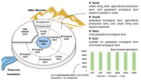 The PLE land in the Xining Marginal area can be summarized by the following model. The PLE land does not exhibit a piecemeal expansion pattern, as it is influenced by mountains and rivers. The agricultural production land and grassland ecological land have advantages for development, whereas the urban living land has just development potential. Furthermore, the development pattern of the Qinghai Lake Basin exhibits a layered structure. The urban living land, agricultural production land, and grassland ecological land all expand outward in that sequence to the north of the Qinghai Lake Basin, with the Qilian Mountains forming the outermost circle. The urban living land, agricultural production land, and grassland ecological land all expand eastward to the south, constrained by the headwaters of three rivers. To the west of the Qinghai Lake Basin, only the development of the grassland ecological land is feasible at elevations above 3300 m. The Qilian Mountains, which are to the east, are suitable for the development of ecological lands with a grassland and forest ecological land (Figure 9).