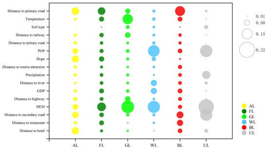 Using land use data from 2010 to 2020, the PLUS model was employed to analyze the factors driving land expansion. The contribution of 16 different driving factors to the changes in various land types was determined, as shown in Figure 5.