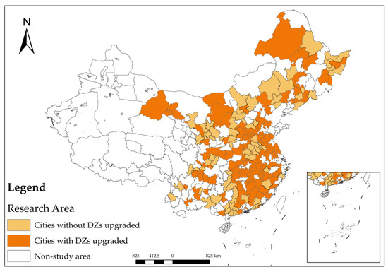 For cities with provincial DZs upgraded to national-level, the variable value of the DZ upgrading (UPDZ) is 1 for the current and subsequent years; otherwise, it is 0.