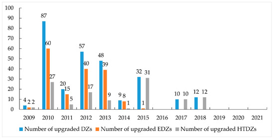 Given that China completed the cleanup and rectification of provincial DZs in 2006, and considering the lack of certain statistical data, this study defines the research period as 2006–2018. Figure 3 shows the number of upgraded provincial DZs from 2009 to 2021. To avoid potential bias from not distinguishing between establishing and upgrading DZs, this study excludes cities with national EDZs or HTDZs established before 2009. Furthermore, cities without provincial EDZs or HTDZs established before 2009, as well as all autonomous prefectures, are excluded. This process yielded 203 cities, with 126 in the treatment group having upgraded DZs and 77 in the control group.