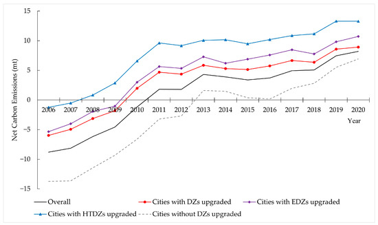 Figure 4 shows that the average net carbon emissions in Chinese cities rose from −8.80 mt in 2006 to 8.20 mt in 2020, with the growth rate slowing after 2011, indicating effective energy conservation and emission reduction efforts. This achievement can be linked to the 12th five-year plan on National Economic and Social Development of the Peoples Republic of China (2011–2015), which first mandated the reduction of carbon emission intensity as a binding target within national economic and social development plans. Analysis by group reveals that, since 2011, cities with DZs upgraded experienced a significantly slower increase in average net carbon emissions compared to those without DZs upgraded. Since 2010 marked a period of intensive DZ upgrades (see Figure 3), this trend likely indicates the emission reduction and sink enhancement effects of the upgrade policy. However, further empirical tests are needed, which will be further verified in Section 4.4. Additionally, trends in cities with EDZs and HTDZs upgraded are similar, warranting further heterogeneity testing.