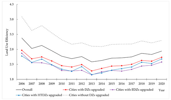 As shown in Figure 5, the average land use efficiency in Chinese cities from 2006 to 2020 exhibits a clear U-shaped trend. The land use efficiency declined between 2006 and 2013 then gradually recovered. Group analysis shows that since 2013, there has been a significant difference in the upward trend of land use efficiency between cities with DZs upgraded and those without. The average land use efficiency in cities with DZs upgraded increased significantly after 2013, while the average land use efficiency in cities without DZs upgraded rose more slowly. This provides preliminary evidence that the upgrade policy can improve urban land use efficiency. However, we need additional empirical tests, which we will further verify in Section 4.2. Further comparisons show that upgrading to national HTDZs has a more pronounced policy effect than upgrading to national EDZs. The land use efficiency improvement of HTDZs after 2013 is more significant, indicating a stronger effect on promoting land use efficiency. Section 4.6 further verifies this.