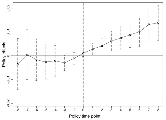 The differences-in-differences method must satisfy the parallel trend assumption. Most empirical studies employ the event study method to conduct ex-ante trend tests, offering evidence for this assumption. Typically, we use the significance level of the ex-ante coefficient to evaluate the fulfillment of the parallel trend assumption. Specifically, ex-ante coefficients pass the parallel trend test if they are not significant [62]. This study uses this method to test the parallel trend assumption by examining whether the urban land use efficiency of the treatment and control groups follows the same trend before the provincial DZs were upgraded. Here is the specification for the event study model: