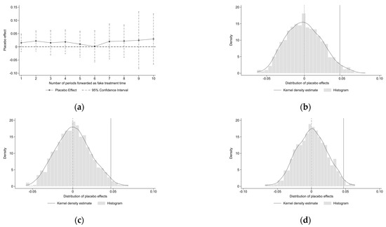Placebo tests: (a) in-time placebo test; (b) in-space placebo test; (c) unrestricted mixed placebo test; (d) restricted mixed placebo test.