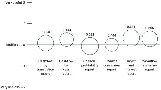 The similarities in views of respondents for both biological and financial (Figure 1) reports from eYield were visualized using the PCI graphic. The resulting PCI values indicated a general indifference by users to the eYield reports in the post-assessment survey, as most PCI values were just under or just over 0.5, suggesting a lack of agreement or disagreement with reports. However, respondents’ thoughts regarding (a) the financial profitability report and (b) the growth and harvest report edged slightly towards conflict and polarization, as these PCI values were 0.722 and 0.611, respectively. Using the size of the circles created in the PCI graphic, a degree of variability in responses can be visualized. The center position of each bubble also represents the mean response, so while it may seem odd that the PCI values do not reflect the position of each bubble with respect to the y-axis, the PCI values also capture variability in agreement on the topic (in this case, the value of each eYield report).