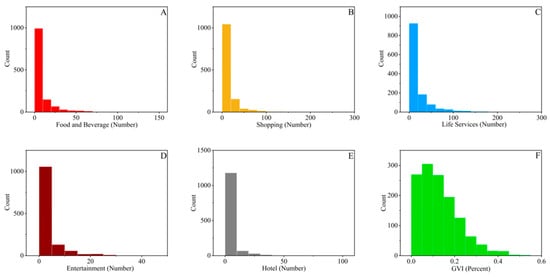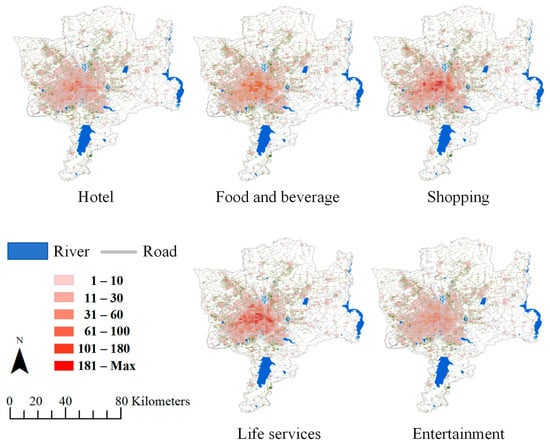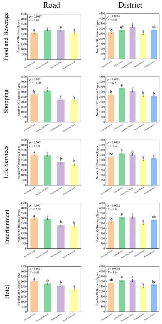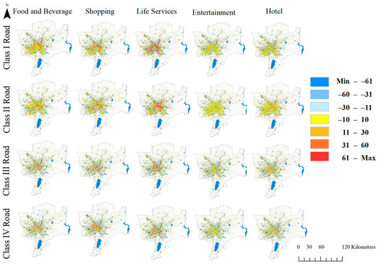 4.2. Variations in Retail POI between Different Levels of Roads across Districts