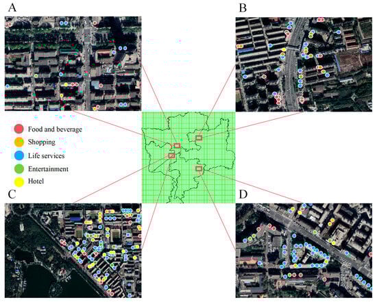 - Huang, C.; Xiao, C.L.; Rong, L.S. Integrating Point-of-Interest Density and Spatial Heterogeneity to Identify Urban Functional Areas. Remote Sens. 2022, 14, 17. [Google Scholar] [CrossRef]