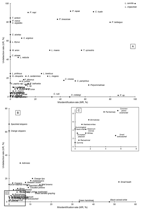 Relation between undetection rates (URs) and misidentification rates (MRs) at the species (A) and FGBO (B) levels, following the Table 1 species and group names. For ease of reading, a zoom image is shown for FGBO levels with low MRs and low URs (C).