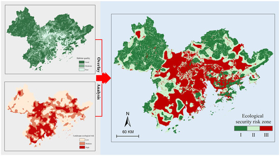 The natural break point method is used to classify the calculated habitat quality of each grid unit in the study area in 2020 into three grades: poor (0–0.30), moderate (0.31–0.60), and good (0.61–1). The landscape ecological risk value of each grid unit is divided into low (0.16–0.29), medium (0.30–0.38), and high (0.39–0.56). After that, the study area is divided into three ecological security risk zones, Grade I, Grade II, and Grade III, according to the rules in Table 2.